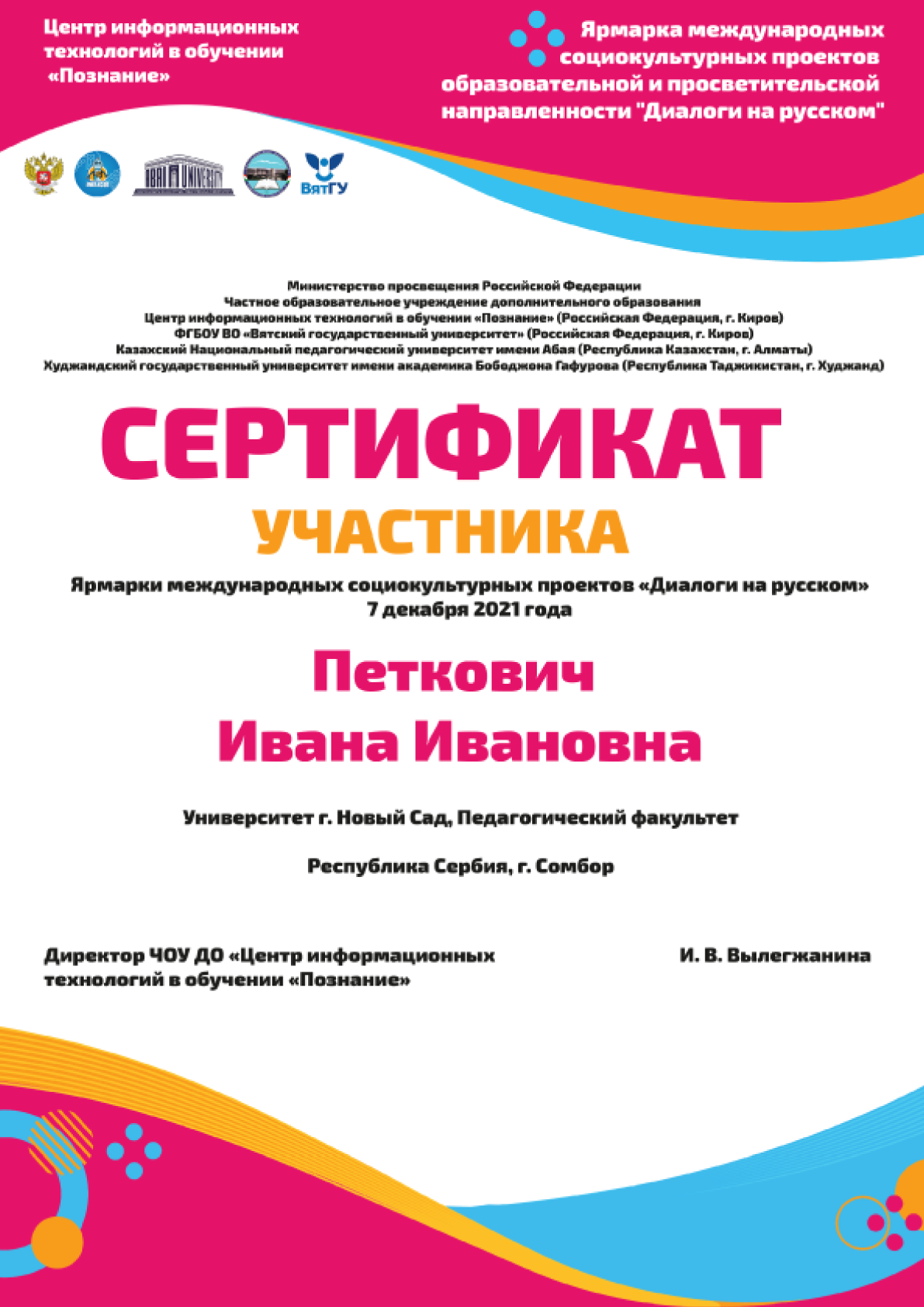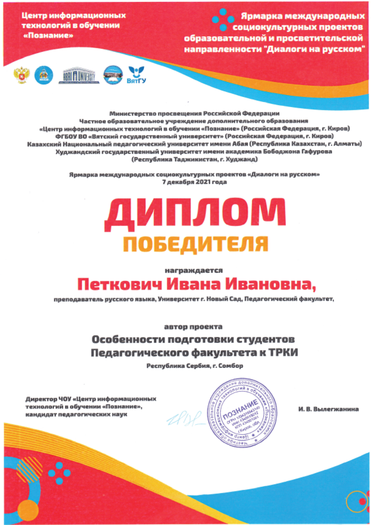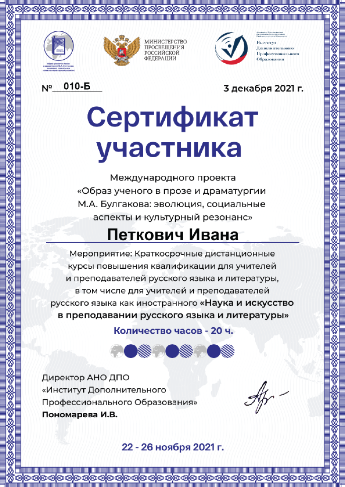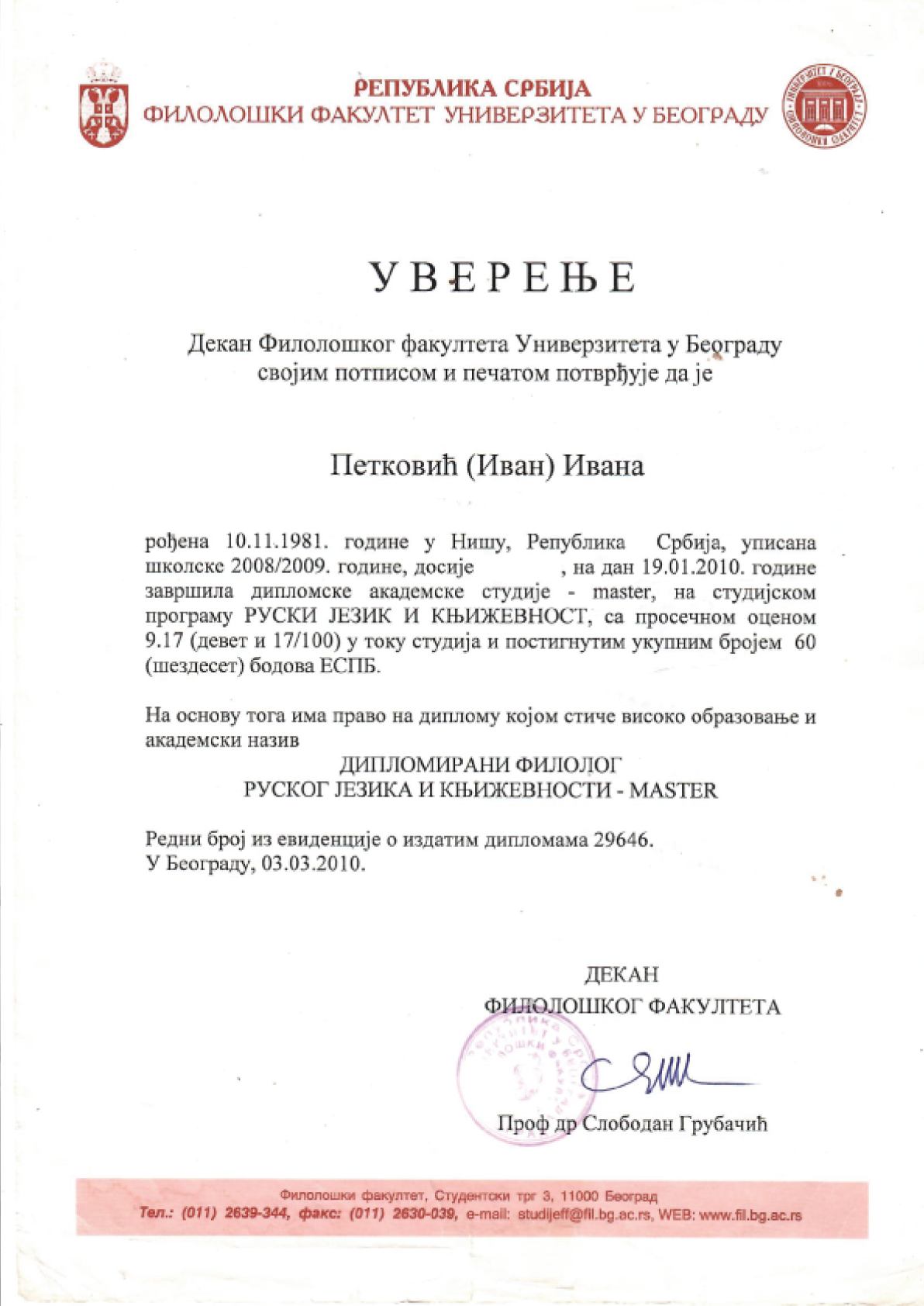 Here you can find diplomas and certificates confirming academic education, professional qualifications, and dedication to high-quality teaching of Serbian and Russian language.